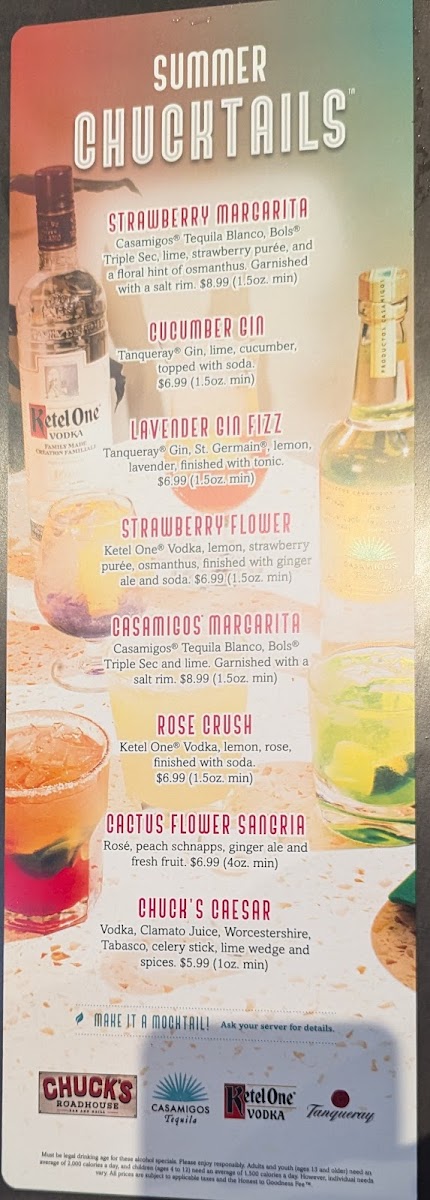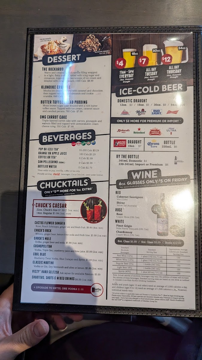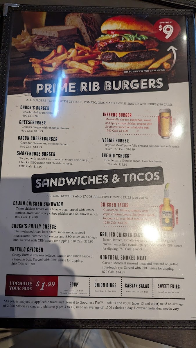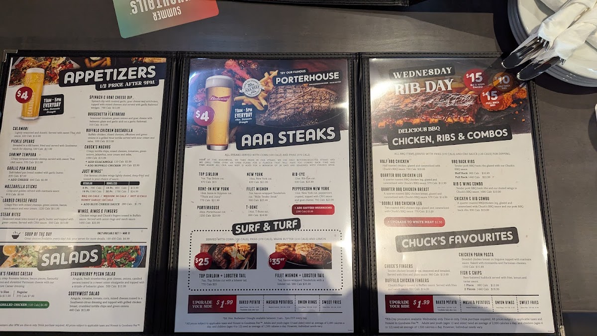 Expect classic roadhouse fare with a focus on satisfying flavors and familiar favorites. From shareable starters like nachos with chicken and steak bites to signature items like the Chuck’s Burger or Rib and Wing Combo, the menu invites a laid-back dining experience. There are also indulgent dinners such as lobster and steak or bbq chicken plates for those looking to enjoy a more substantial meal.